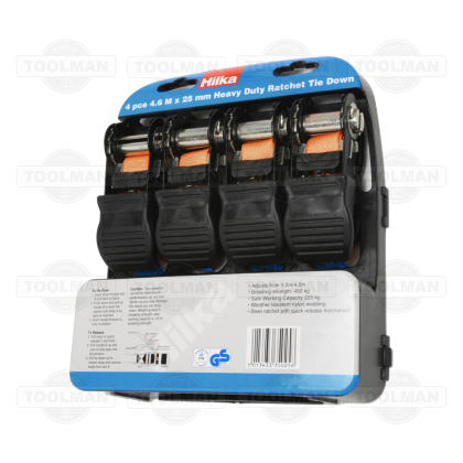 A set of 4 weather resistant nylon tie downs, with steel ratchet quick release mechanisms.