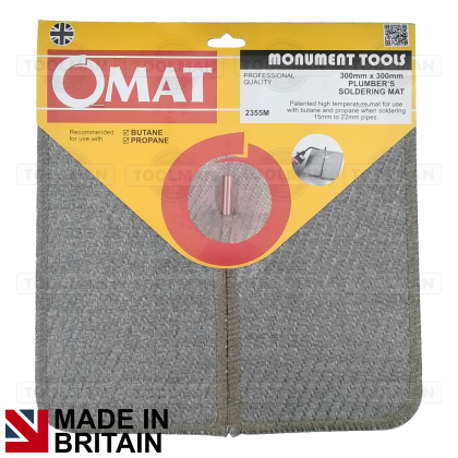 OMAT is manufactured from heavy duty density glass weave fibre. The cut out shape enables the mat to be wrapped around pipe work reducing the risk of damage to the surroundings when using a gas torch. Make sure you use the correct sized mat for the work you are doing. Place the mat behind the work, but not too close so that the flame is always on the same point of the mat. The OMAT is designed for use with butane and propane gas and will provide protection in most soldering work. Remember that the flame temperature of your torch is hot enough to melt steel so exercise caution. Do not lay the mat on a floor and solder it because damage to the floor and floor covering will occur. If the mat should start to glow at the point of the flame, move the mat around. Use unheated parts of the mat to continue work. The unique OMAT die cut shame with overlap with give a tight fit around the pipe. OMAT is subject to wear and tear during normal use. A damaged or burnt mat should not be used as it will not offer the stated protection. Check your mat each time before use.