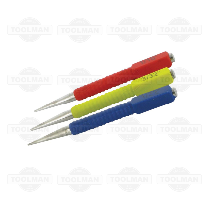 Precision milled and fully hardened carbon steel. Includes sizes 1/32″, 2/32″ and 3/32″. Square, colour-coded polypropylene coverings provides extra grip.
